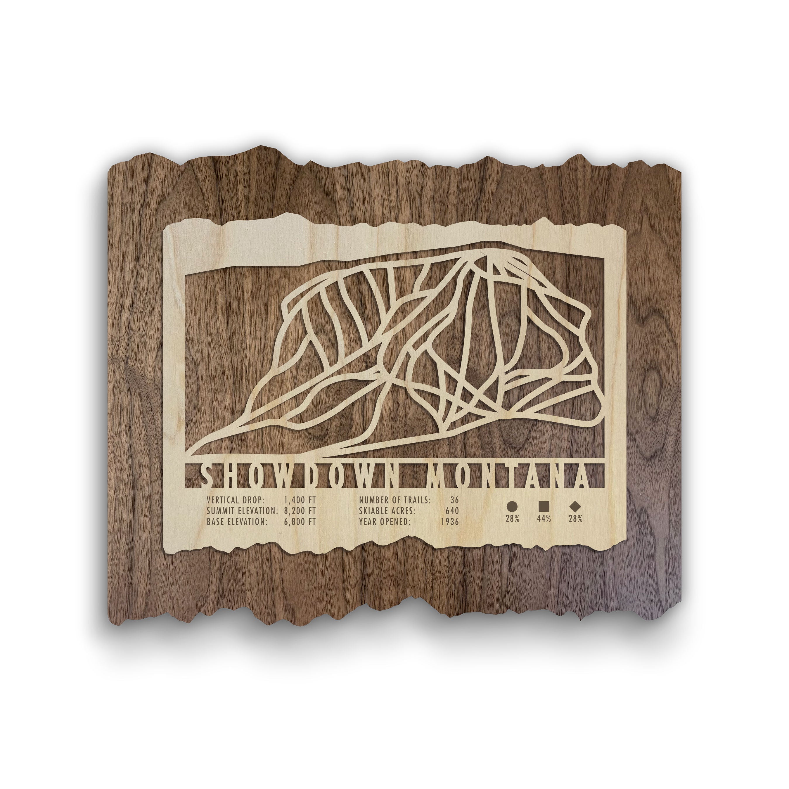 The Showdown Montana Ski Map is a multi-layer wooden wall art piece that celebrates the spirit of skiing and snowboarding at Showdown. Featuring two laminated layers, the map highlights the intricate trails hand-traced and precisely laser cut to showcase the unique layout of the mountain. Its detailed design allows skiers and snowboarders to explore and appreciate the terrain when they can't be on the mountain. This artistic map makes an ideal gift for outdoor enthusiasts, bringing a touch of adventure and Montana’s stunning winter landscape into any space.